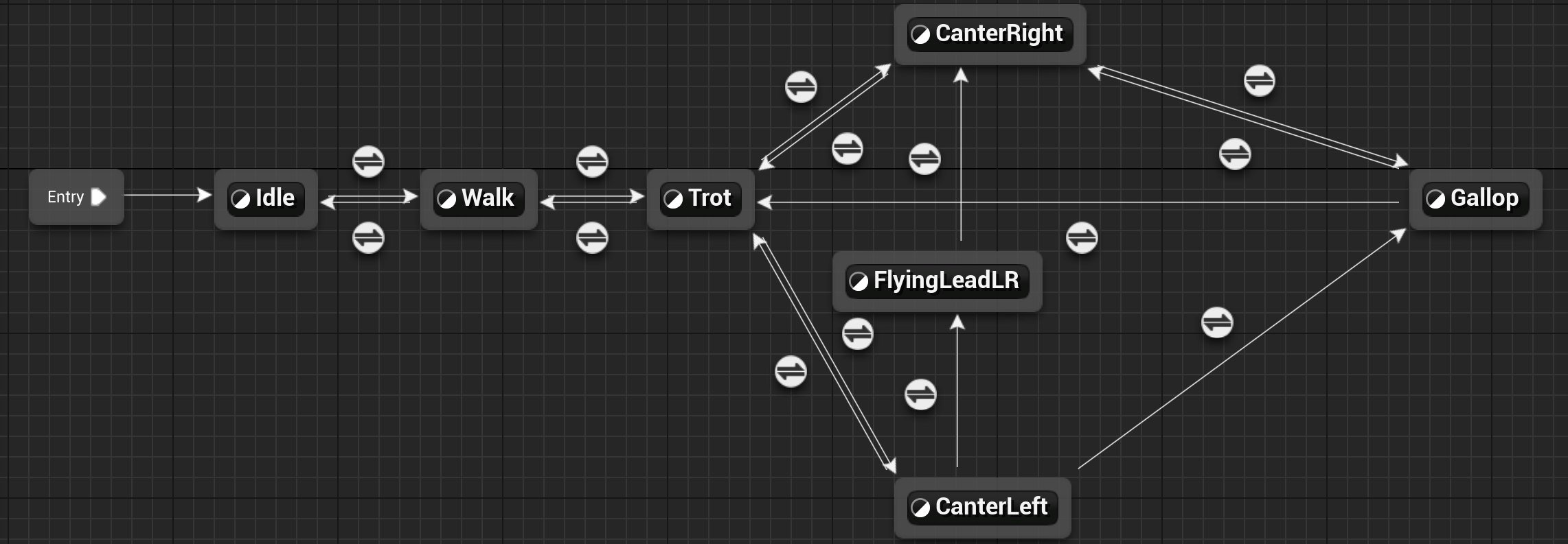 For the uninitiated, the average horse has four distinct gaits: Walk, trot, canter, and gallop. Though some breeds have gait variations and other breeds have one additional gait, we're not concerned about those here. These four gaits are distinct from each other and when moving; the horse is either in one of these gaits or not. This is unlike a human whose two-legged gaits of walk and run can be (fairly) seamlessly blended between without issue (frequently using a single blendspace).